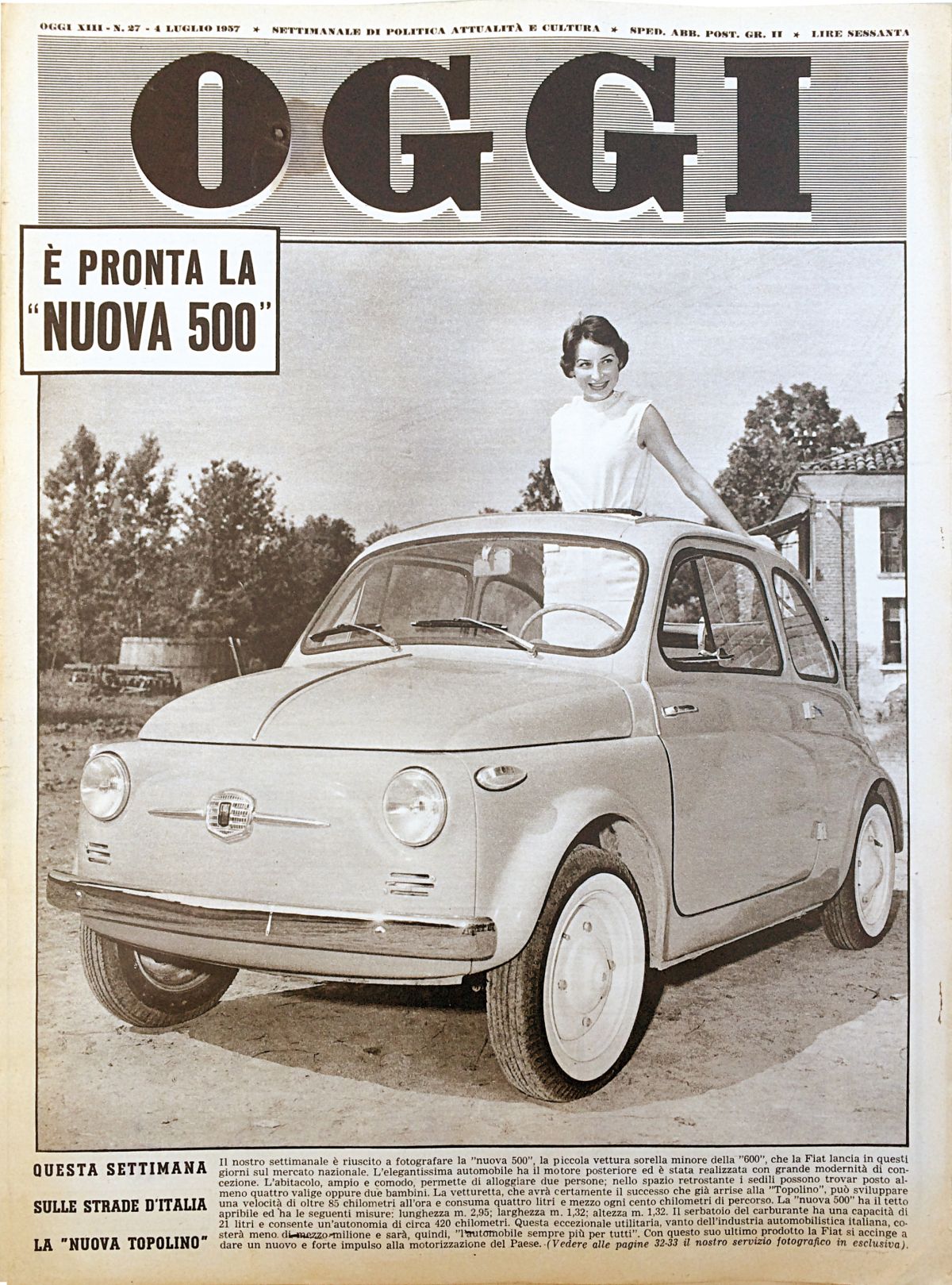 ll 4 luglio 1957 compariva la prima Fiat 500: l’utilitaria più amata di sempre. Simbolo di rinascita, di famiglia, di design ai massimi livelli della semplicità, ha motorizzato l’Italia, riunito al volante nonne e nipoti ed oggi, nella sua terza giovinezza, è ambasciatrice di solidarietà e di turismo a misura d’uomo. Ne rimangono circolanti oltre 400mila esemplari, un record. Per celebrare l’anniversario al via il 7 luglio il Meeting internazionale con oltre mille Fiat 500 da tutto il mondo, un museo multimediale rimesso a nuovo ed ampliato, mostre, racconti e un nuovo libro dedicato agli ingredienti di un mito che racchiude un’inesauribile positività: a partire dall’essere nato zoppicante prima del successo.